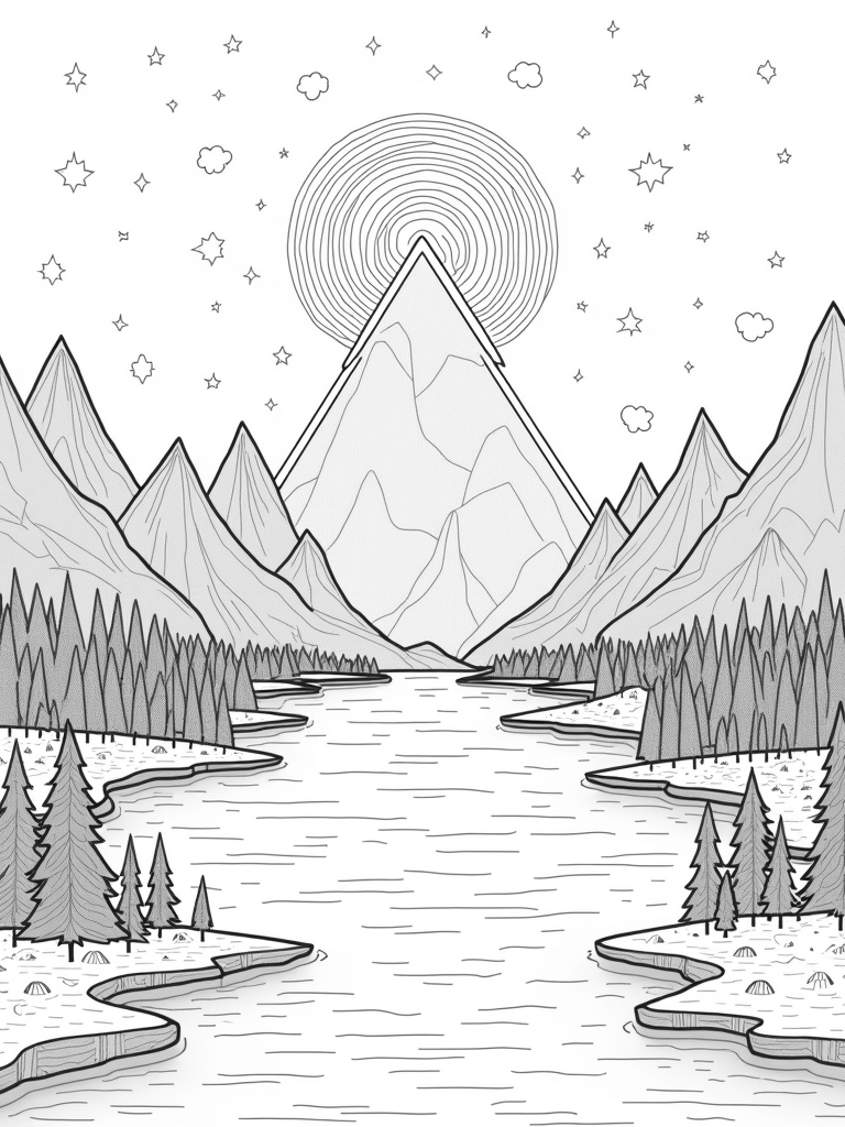 This coloring page showcases a stunning geometric landscape made entirely of triangles! You’ll see towering triangular mountains that reach up to a starry sky, each peak decorated with unique patterns. In the foreground, there's a beautiful lake that mirrors a giant equilateral triangle floating above it, giving off a soft, magical glow.