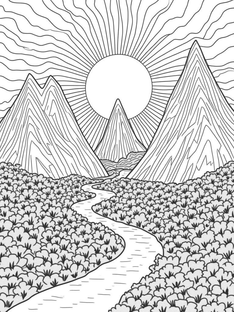 Check out this free, printable coloring page featuring a stunning triangular landscape. With mountains, flowers, and more, it's perfect for kids who love geometric shapes and want to have some colorful fun!