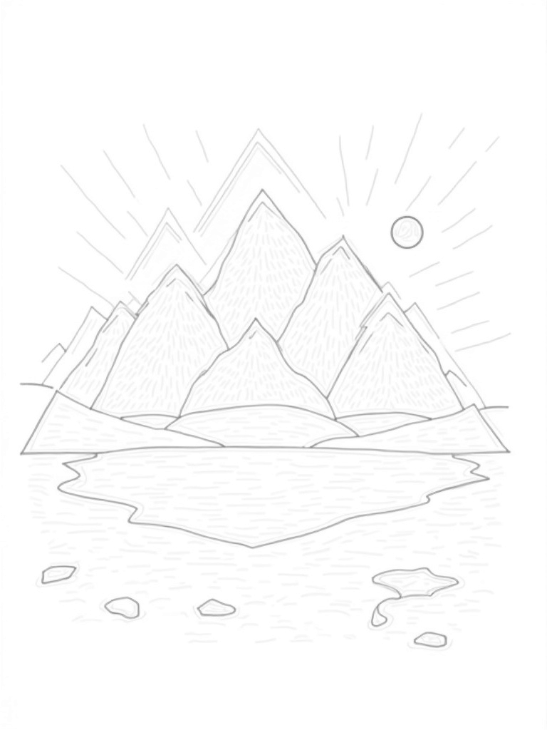 Along the edge of the lake, you’ll see smaller triangular stones that form a path leading to a distant triangular sun setting behind the peaks. The sun radiates sharp, angular lines that match the theme of the mountains, making it all feel connected. Kids can have a blast coloring in the various patterns and shapes, letting their imagination run wild!