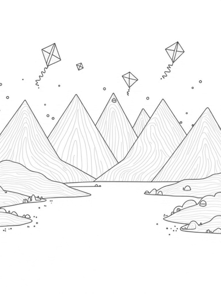 Triangular Mountain Landscape with Kites and Lake Coloring Page