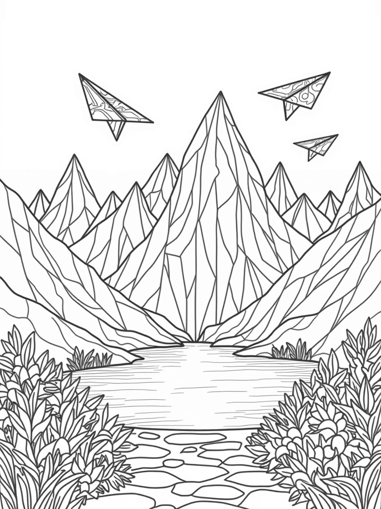 Check out this free, printable coloring page featuring a stunning triangular mountain landscape, complete with origami planes and a tranquil lake. It's perfect for kids who love geometric designs and want to get creative with their colors!