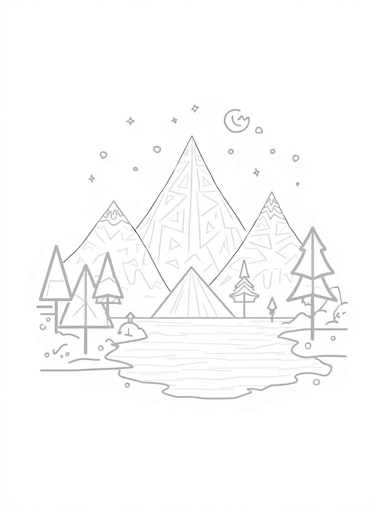 In this stunning scene, a massive mountain range made entirely of triangles reaches for the stars. Each peak is decorated with cool geometric patterns that will make your coloring come alive! Below, a peaceful lake mirrors the majestic mountains, and its surface is cleverly divided into triangular segments that look like they’re rippling fabric.