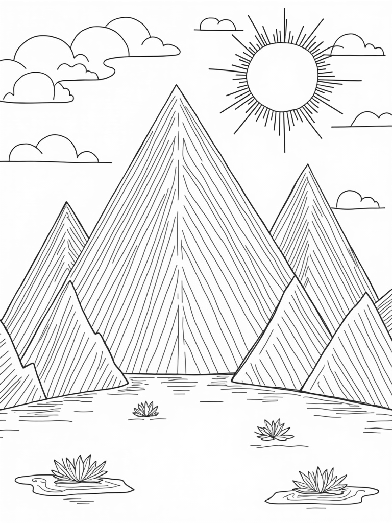 Above the mountains, the sky is filled with playful geometric clouds, creating a patchwork of soft colors. And don’t miss the big, cheerful sun with its triangular rays spreading warmth throughout the scene. It’s a perfect backdrop for some creative coloring fun!