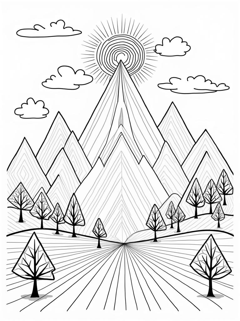 Triangular Prism and Colorful Mountain Landscape Coloring Page