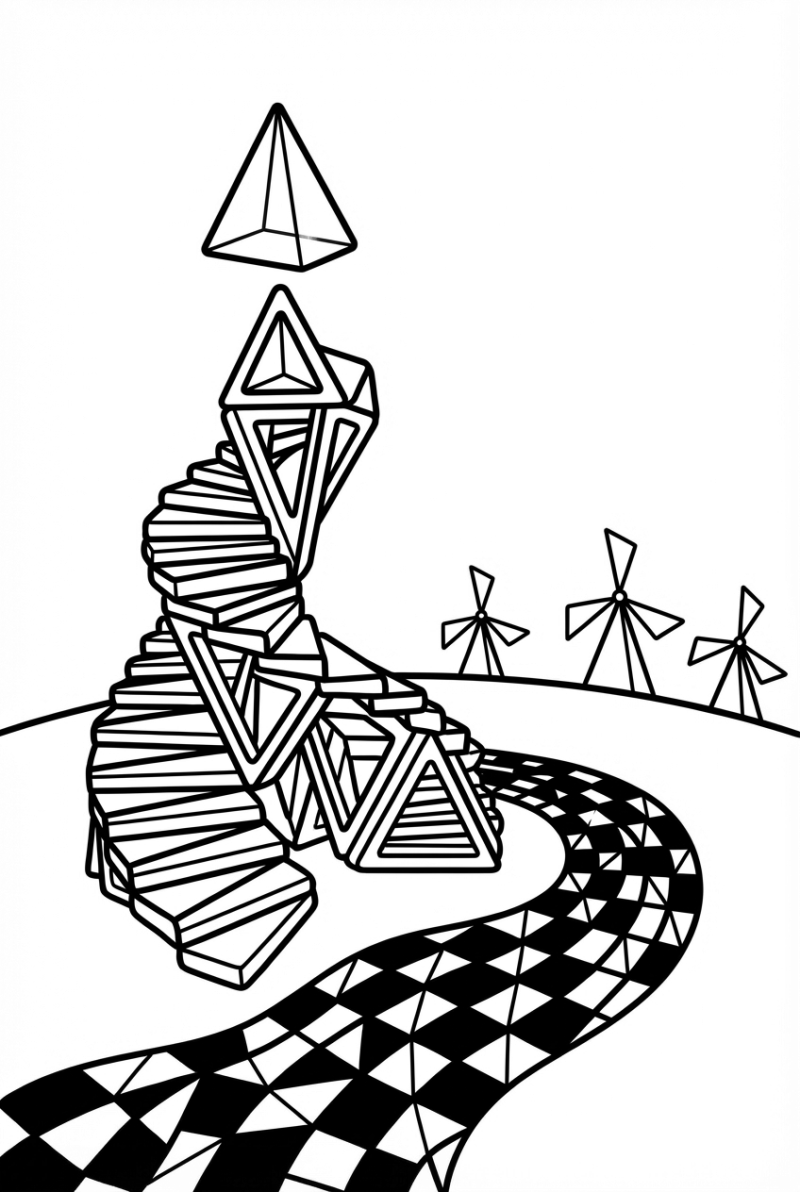 Look at the towering cascade of interlocking triangles that wind upward like a stairway to the sky. At the very top, a huge crystal triangle hangs, almost like a frozen jewel. Down at the base, a river of checker‑patterned triangle tiles snakes its way around, giving the whole scene a playful flow. On the horizon, three triangular windmills spin their blade‑triangles, adding a bit of motion to the picture.