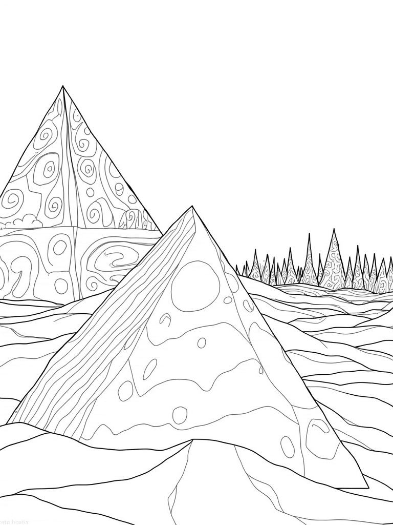 Get ready to bring to life a stunning landscape filled with oversized triangles! In the foreground, a massive triangle stands tall like a mountain, its surface covered in intricate line designs just waiting for your colorful touch. Above, smaller triangles float in the air, creating a playful dance of colors and casting unique shadows on the ground.