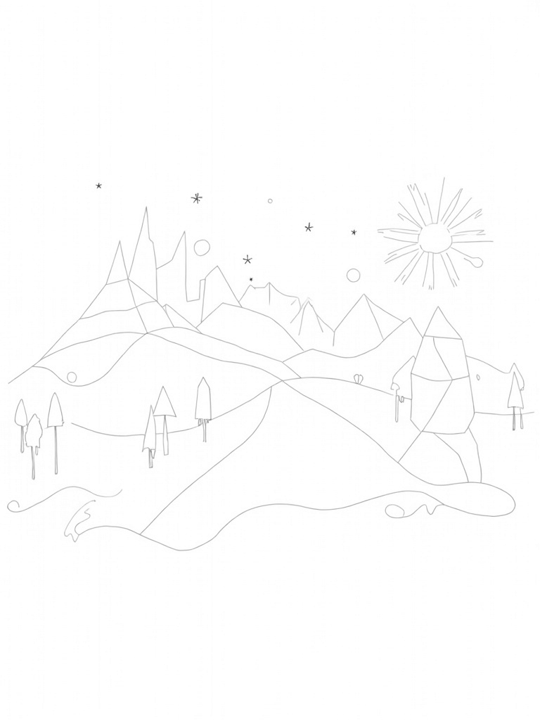 Right next to the mountains, there’s a playful city skyline built from stacked triangles, just waiting for your creative touch. A winding river flows through this unique valley, lined with triangular trees that look like they’re straight out of a craft project. Don’t forget to color those oversized triangular stars floating above – they’ll add a magical touch to your masterpiece!