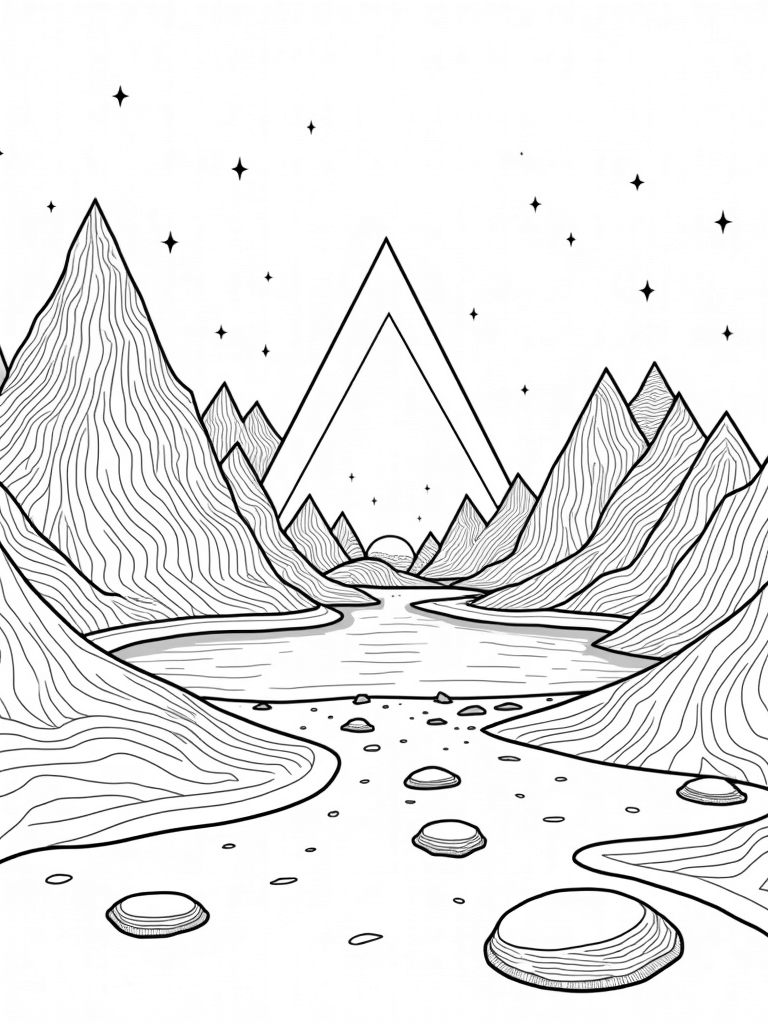 Imagine a world where everything is shaped like triangles! This page is filled with giant triangle mountains that rise high into a starry sky, decorated with swirling patterns that will make your imagination soar. In front of these peaks, there's a peaceful lake that perfectly mirrors the triangle shapes above, creating a magical symmetry that invites you to color both the mountains and the water.
