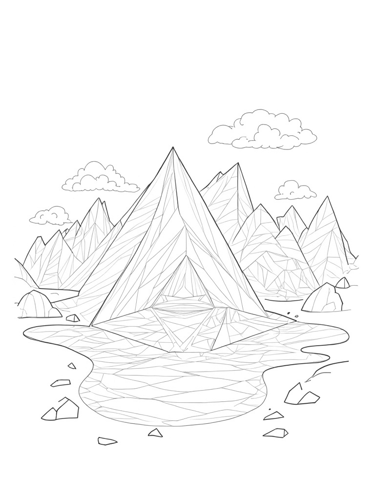 In the background, towering triangular mountains reach up to the clear sky. Each mountain is decorated with intricate triangular carvings, making them look almost like big puzzles waiting to be colored. And don’t forget the fluffy triangular clouds floating above—they add a fun twist to the whole scene. This coloring page is perfect for letting your imagination run wild with colors!