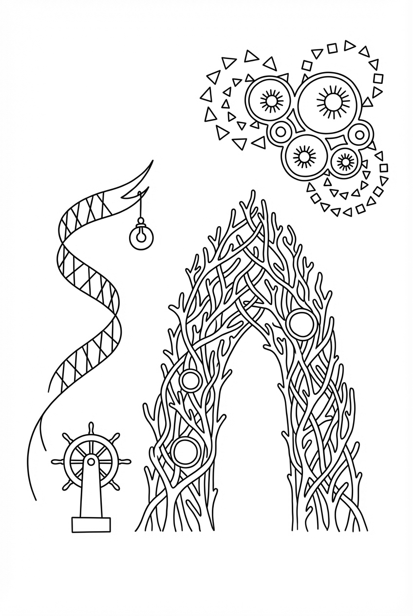 Look at that towering coral cathedral – the arches are made of staghorn branches that look like natural stone but softer. The windows are actually sea anemones, so you’ll get to fill in some translucent shapes. A spiraling kelp vine acts like a winding ladder and ends with a pearl lantern hanging just above. Below, a rusted ship‑wheel has been turned into a compass rose perched on a basalt block, and floating bubble domes hold little lanterns, each surrounded by a ring of geometric fish.