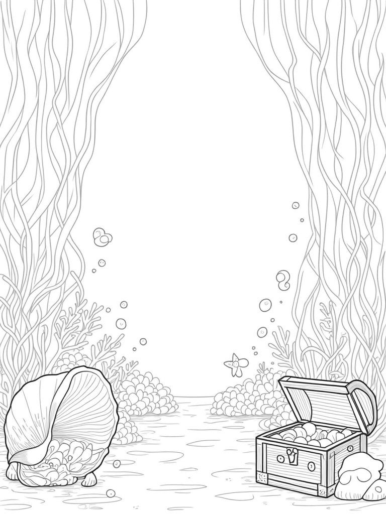 This coloring page showcases a vibrant underwater garden filled with oversized seaweed that sways gently like curtains in the ocean's currents. Right in the foreground, you'll find an enormous conch shell, its intricate patterns inviting you to add your own colors. Nearby, spiral-shaped coral formations are playfully adorned with tiny starfish, making them even more fun to color.