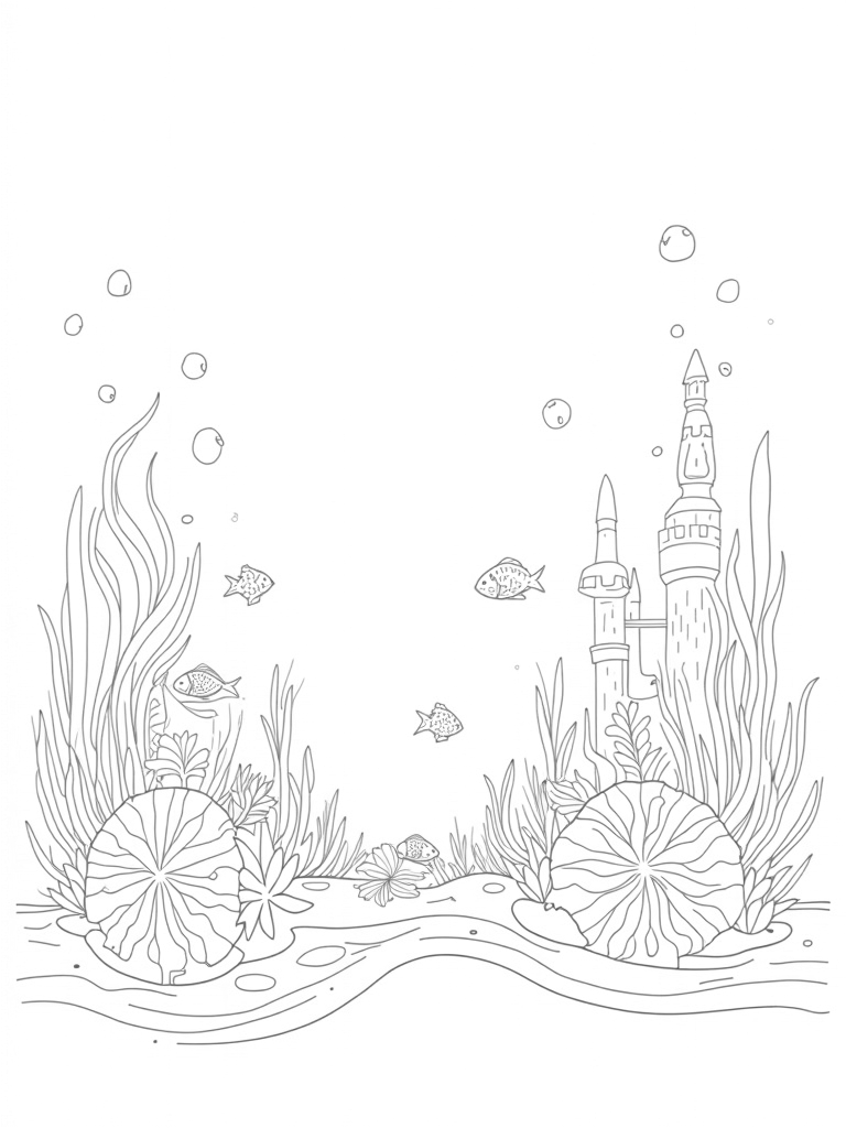 Mystical Underwater Garden with Coral Castle and Sea Anemones Coloring Page