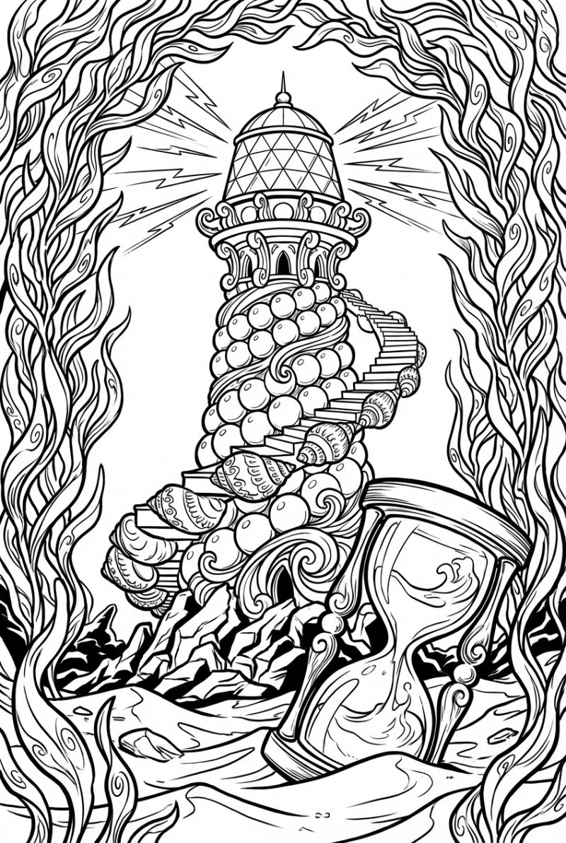 Spot the tall pearl lighthouse rising from the sea floor, its glass dome catching shafts of light. Around it, huge seashells twist upward, each one acting like a rung on an invisible staircase. Framing the scene are arches of kelp that sway like ribbons, their fronds tangled like vines. Nearby, a massive hourglass is half‑buried in sand, with sand pouring up through its chambers for a playful twist.