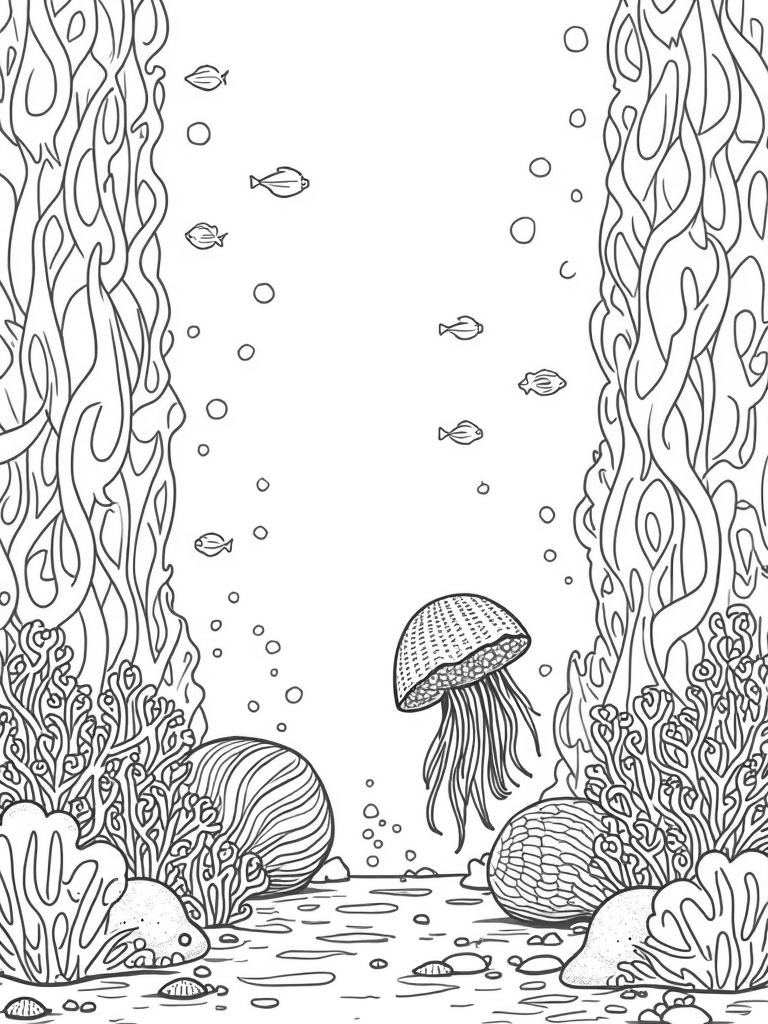 Serene Underwater Garden with Jellyfish and Seashells Coloring Page