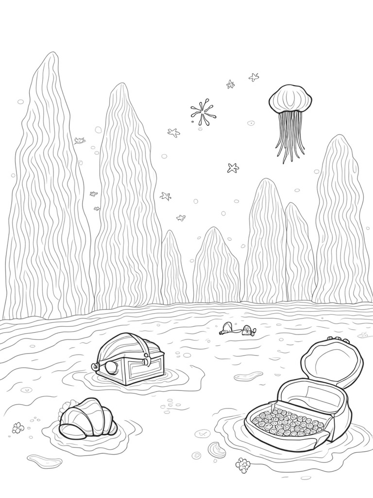 Check out this free, printable coloring page featuring a whimsical underwater city with coral skyscrapers, a jellyfish chandelier, and hidden treasures. Perfect for kids who love ocean adventures and coloring fun!