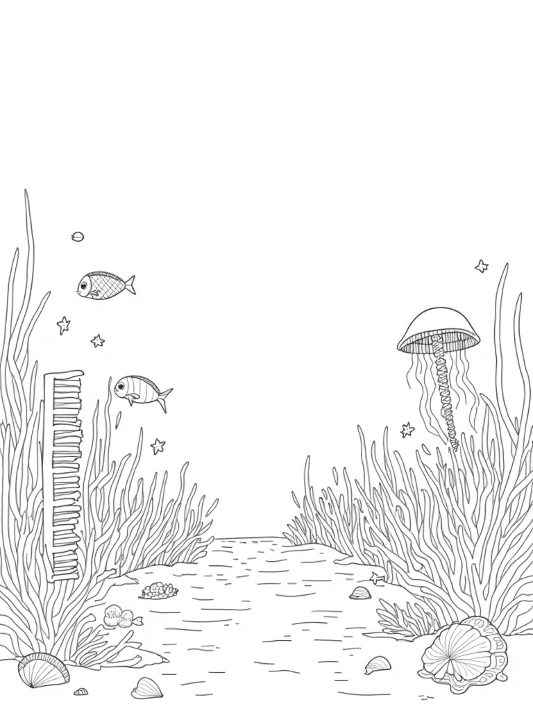 Floating above this musical coral wonderland, jellyfish drift gracefully, their bodies casting beautiful shadows on the sandy floor. It’s like a magical light show down there! As you color, imagine the seashells scattered below, each one a treasure waiting to be discovered. The whole scene is not just a feast for the eyes, but a wonderful opportunity for creativity!