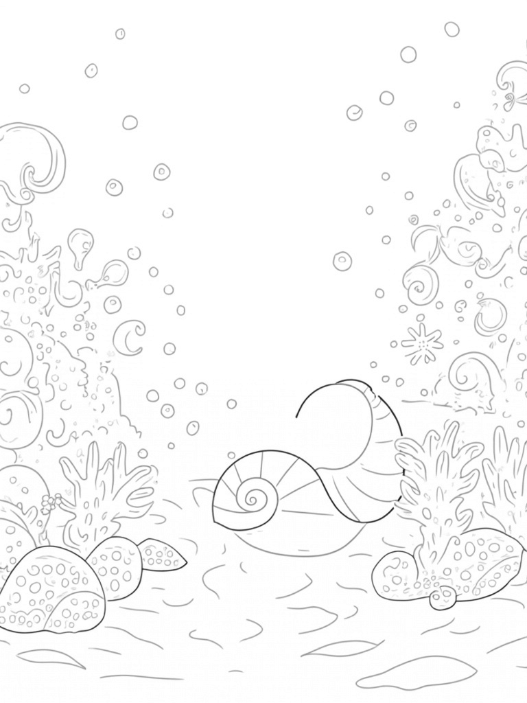 At the bottom of this magical underwater garden lies a giant, spiral shell adorned with cool geometric designs. It’s a perfect spot for imaginative kids to add their favorite colors! And let's not forget the playful schools of fish darting around in the background, leaving delicate trails through the water. They add a lively touch to this serene ocean scene.