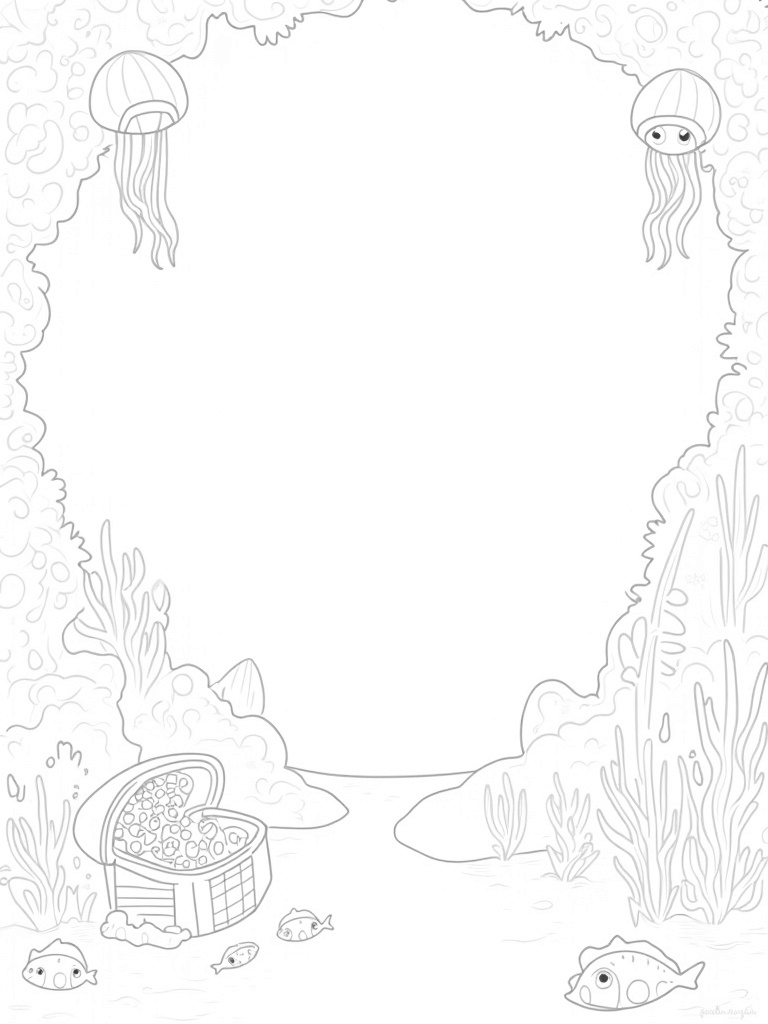 Floating above, whimsical jellyfish dance gracefully in the water. Their tentacles trail behind them like ribbons, adding to the magic of this underwater garden. The light filtering down from the surface creates a peaceful glow, making everything feel serene and calm. It’s a perfect spot for your imagination to run wild as you add your own colors!