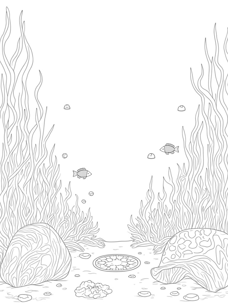 As you color, notice the bubbles rising from a patch of colorful pebbles. They add a playful touch to the scene, making it feel alive and dynamic. In the background, schools of fish with unique, angular designs swim through the lush flora, bringing movement to the tranquil underwater world.