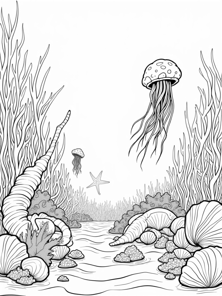This coloring page is filled with a vibrant underwater garden. You'll spot oversized coral formations that twist and spiral upwards, creating a magical scene. Scattered throughout are whimsical seashells in all sorts of shapes and sizes, just waiting for your favorite colors to bring them to life!