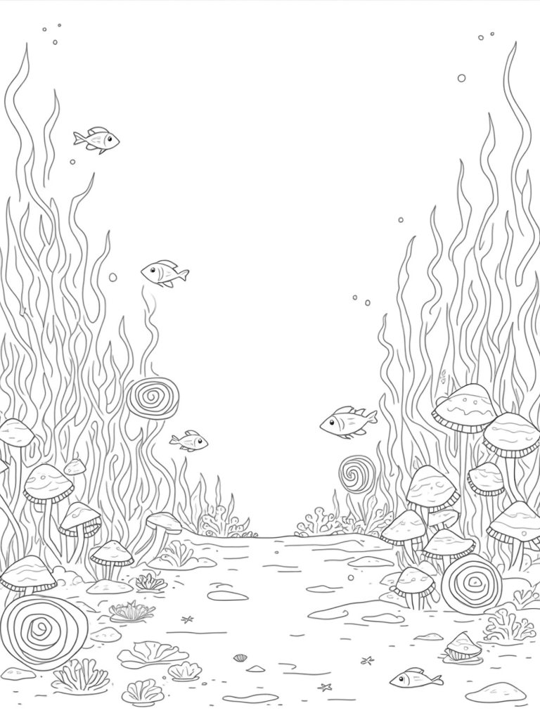 In this vibrant underwater garden, giant, swirling seaweed reaches up towards the bright surface, creating a playful dance of green and blue. You’ll find a cluster of coral formations, resembling towering mushrooms, each one decorated with amazing patterns just waiting for your favorite colors. Nearby, a cheerful school of fish swims through some oversized jellyfish that look like they’re floating on air, adding a magical touch to this ocean scene.