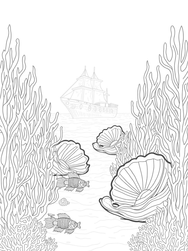 This coloring page shows an amazing underwater garden filled with towering coral formations that look like spirals reaching up from the sandy floor. Nestled between these colorful corals are large clams, wide open to reveal their beautiful, shimmering pearls. Can you imagine how they sparkle in the water?