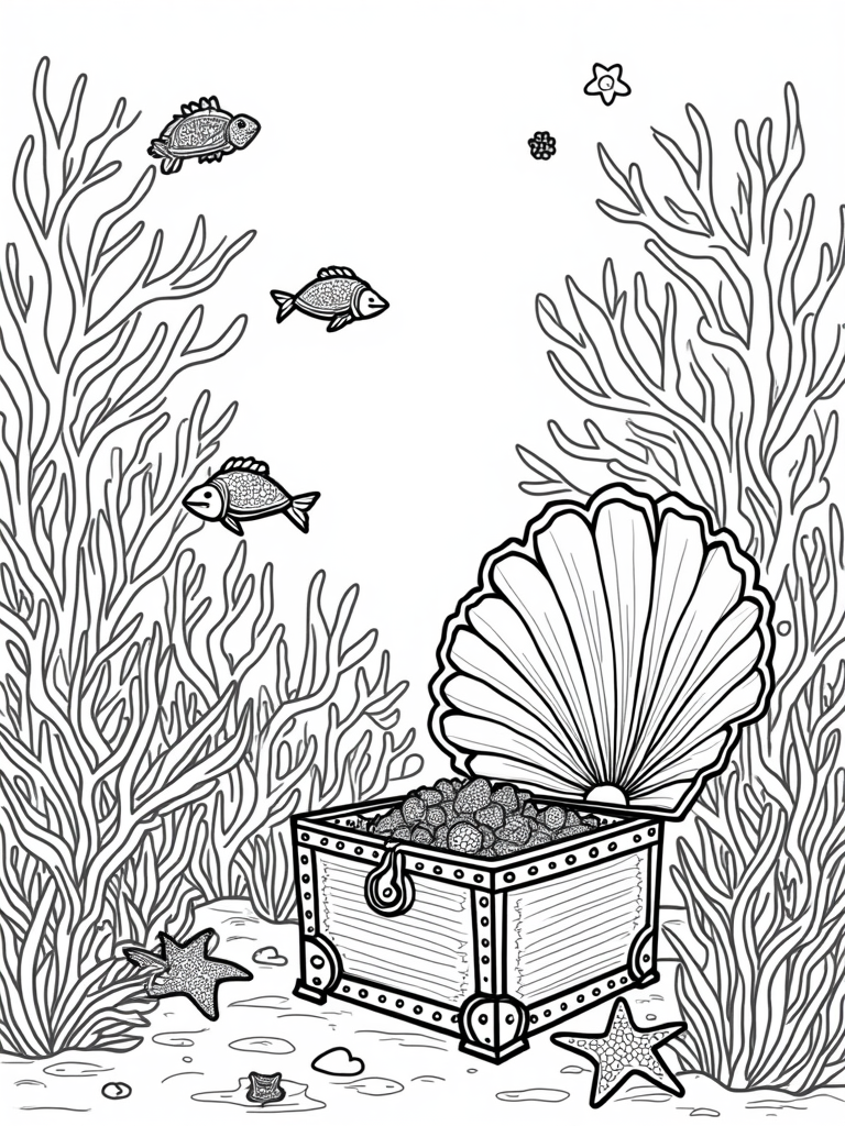 In the foreground, there's a treasure chest overflowing with sparkling gems that shimmer like stars under the sea. Surrounding the chest, swaying seaweed and curious starfish dot the ocean floor, inviting your imagination to come alive. It’s a vibrant underwater world just waiting for your favorite colors!