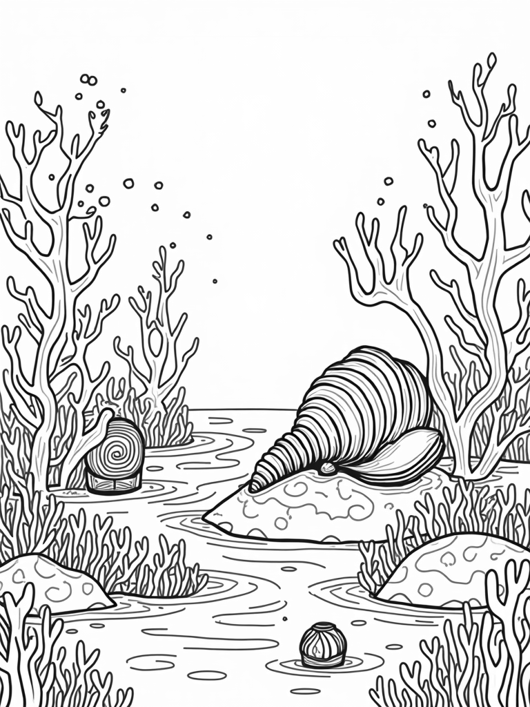 Imagine an underwater garden filled with oversized coral formations that look just like fantastical trees, their branches twisting in the most elegant ways. Schools of geometric fish swim around, creating playful patterns as they dart through the open spaces. You might even spot a giant seashell resting on a sandy mound, its spiraled surface beautifully etched with swirling designs.