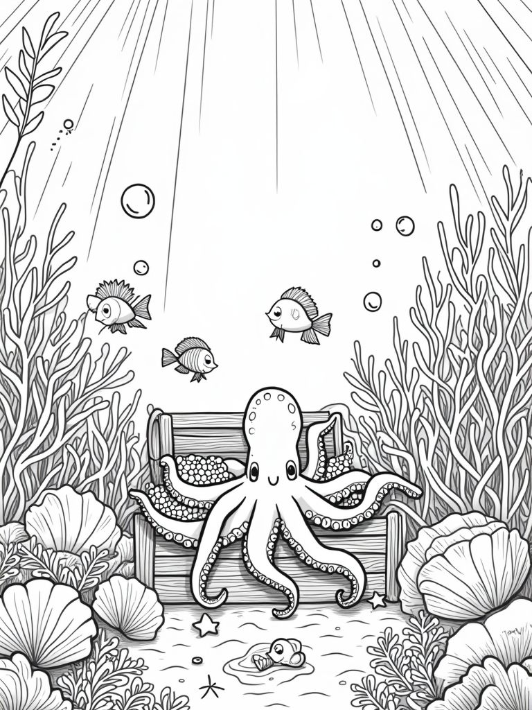 Underwater Garden with Friendly Octopus and Treasure Chest Coloring Page
