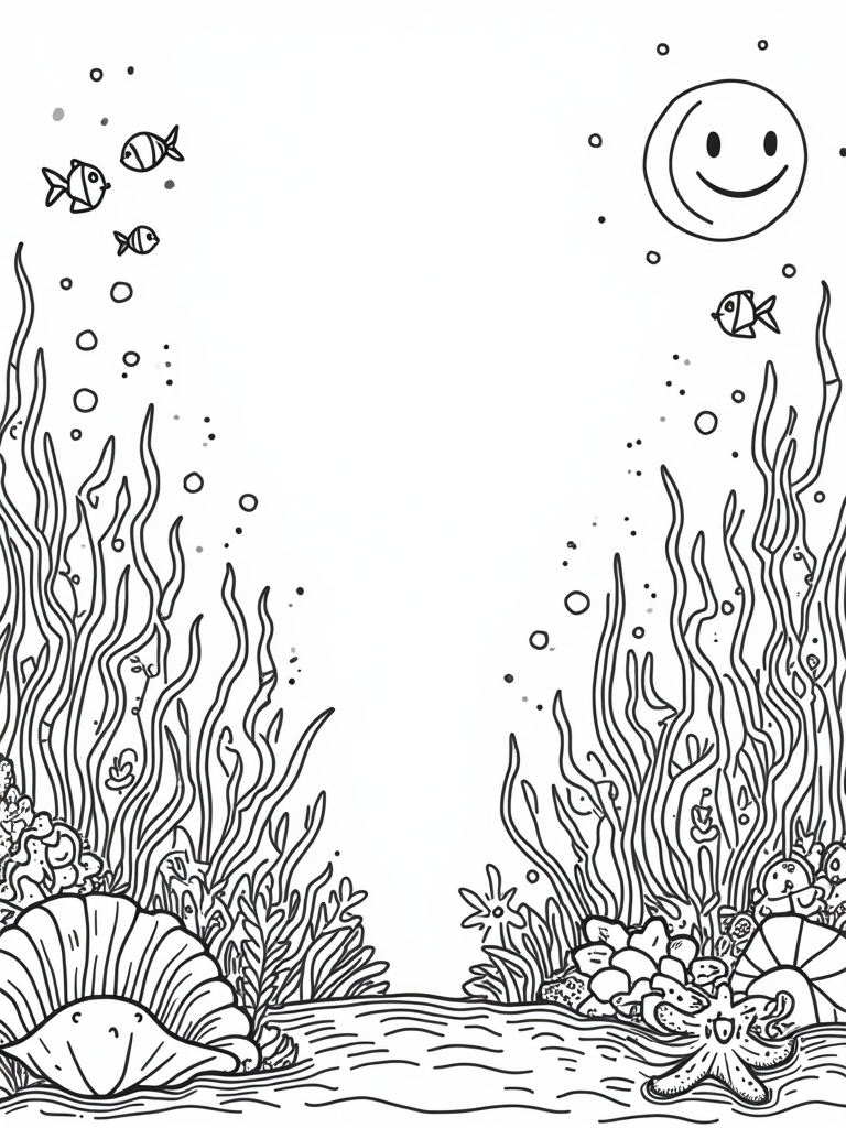 Imagine a magical underwater garden filled with huge, playful plants that sway with the gentle currents. In the foreground, there's a giant seashell that’s home to some friendly starfish just chilling on its edge. Look closely, and you'll spot vibrant coral formations rising up like colorful towers, all adorned with bubbly surprises. A school of smiling fish darts around, leaving behind sparkling trails that add a touch of magic to this underwater scene. And don't forget the sun peeking through the water's surface, bringing warm light to this enchanting world.