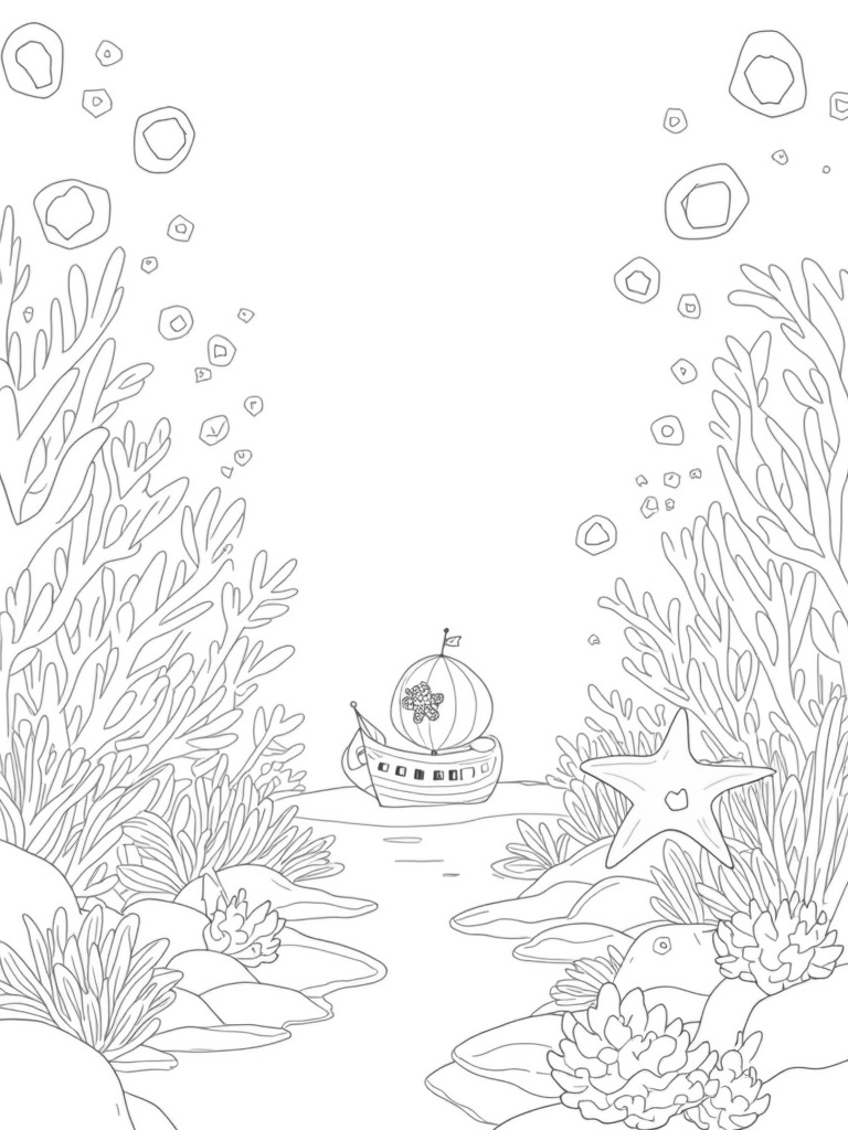 Picture a vibrant underwater garden filled with oversized coral structures that look like colorful geometric shapes, reaching up like a rainbow! Swirling seaweed dances around bubbles that float up, each one holding a tiny marine creature, just waiting for your colors to bring them to life. There’s even a cozy cluster of starfish lounging on a flat rock, their arms stretching out like rays of sunshine. And in the background, there’s a whimsical sunken ship peeking out from the sand, with glowing plants shining through its portholes.