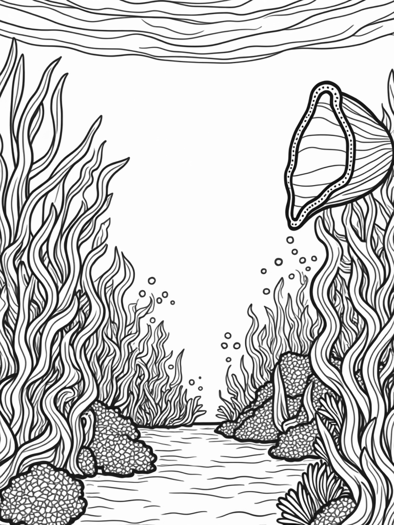 Underwater Garden with Giant Conch Shell and Geometric Fish Coloring Page