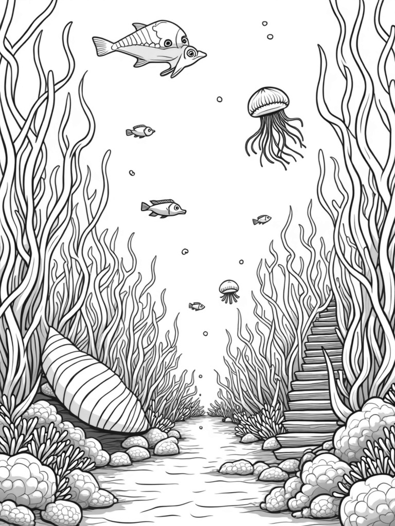 Imagine a magical underwater garden where seaweed sways like towering trees! In the foreground, a giant conch shell opens up to reveal a spiral staircase leading deep into the ocean. Nearby, a cluster of glowing jellyfish floats gracefully, their long tentacles flowing like ribbons in the current. Look up, and you’ll see a school of fish swirling in a beautiful dance above a vibrant coral reef bursting with intricate patterns.
