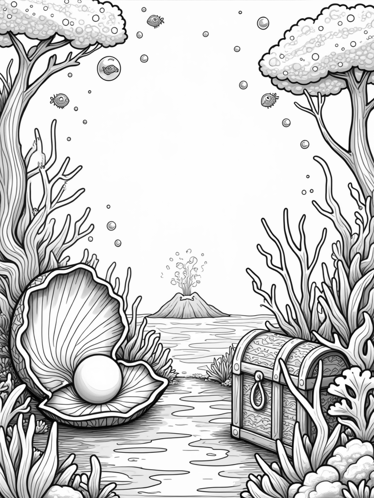 Take a look at this magical underwater garden! You’ll find oversized coral formations that look like trees, swaying gently with the water’s rhythm. Right up front, there’s a giant seashell that’s opened up to reveal a stunning pearl, just waiting for some color. And don’t miss the tiny fish as they swirl around a treasure chest that's been resting on the sea floor, covered in intricate designs!