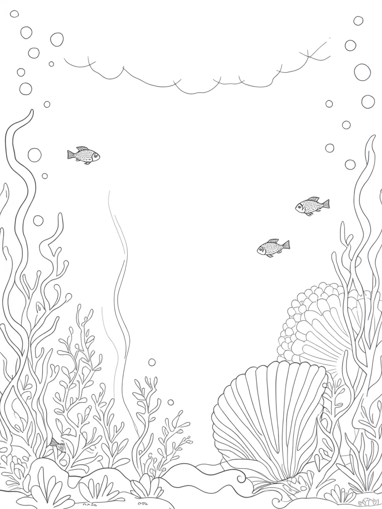 Underwater Garden with Giant Seashells and Fish Coloring Page