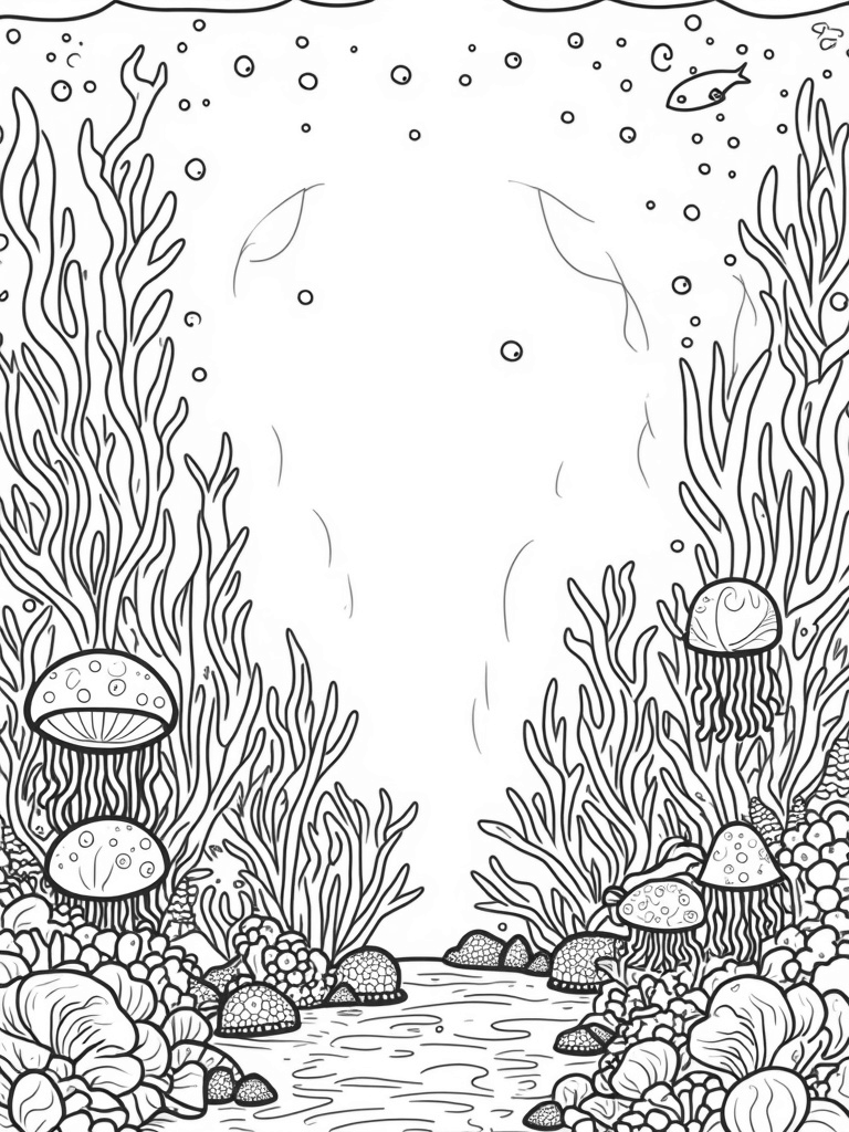 This page showcases a vibrant underwater garden filled with oversized seaweed that swirls like ribbons. Towering coral formations rise up, looking like intricate sculptures, and tiny bubbles add a fun touch. Nearby, a cluster of glowing jellyfish floats gracefully, their tentacles trailing like soft curtains, inviting your imagination to take flight.