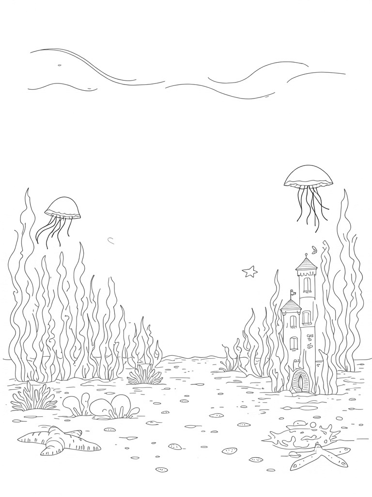 This coloring page showcases a stunning underwater garden filled with oversized seaweed that spirals overhead, creating a magical archway. You’ll spot luminous jellyfish floating gracefully, their tentacles trailing down like colorful ribbons. In the foreground, a cluster of coral looks just like a whimsical castle, complete with intricate patterns and tiny openings that invite your imagination.