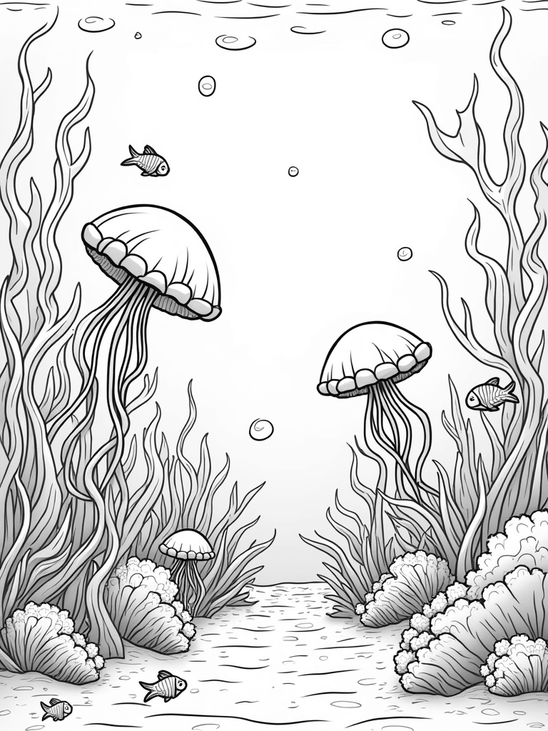 Underwater Garden with Jellyfish and Coral Ruins Coloring Page