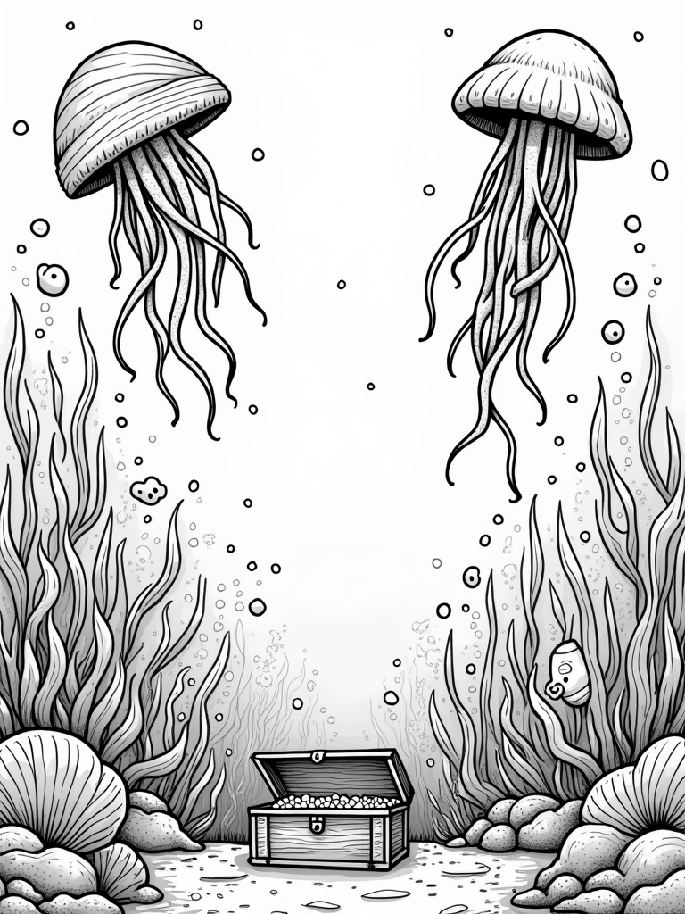 Underwater Garden with Jellyfish and Seashells Coloring Page