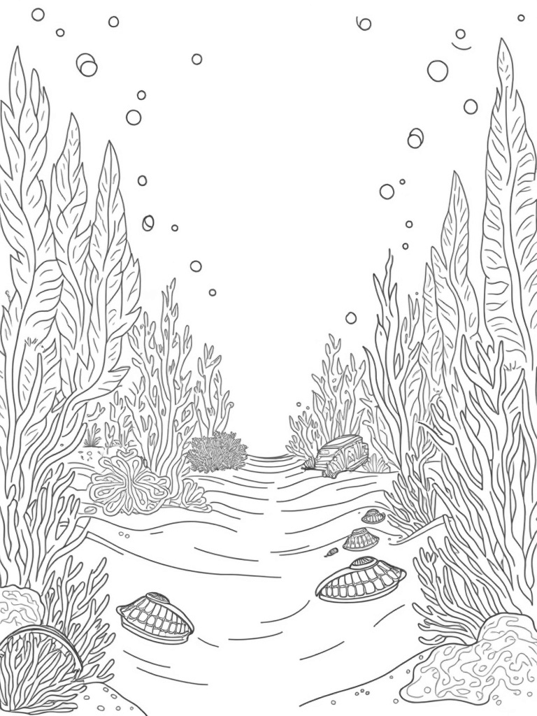 This coloring page brings to life a stunning underwater garden. Imagine towering kelp forests swaying gently in the ocean currents, creating a lush habitat for sea creatures. Scattered across the sandy sea floor are giant seashells, each showcasing unique and intricate patterns just waiting to be filled with your favorite colors.
