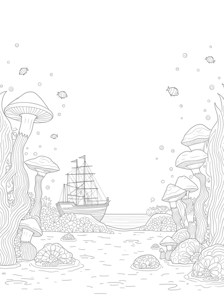 Imagine a magical underwater garden bustling with oversized coral formations that look like colorful, whimsical mushrooms. Above them, schools of geometric fish dance through the water, their bright colors making them look like kites soaring in the sky. Down below, an ancient shipwreck rests quietly on the ocean floor, its mast tangled in soft seaweed, adding a touch of mystery to the scene.