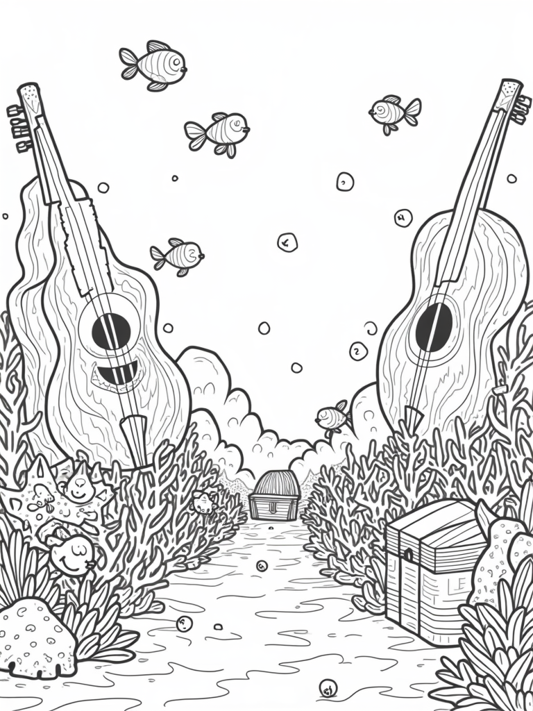 This coloring page captures a vibrant underwater garden filled with coral formations shaped like musical instruments. Imagine oversized guitars and trumpets blending seamlessly into the ocean floor, surrounded by friendly fish that dart in and out of the coral. Some of these fish are even blowing bubbles that turn into musical notes—how cool is that?