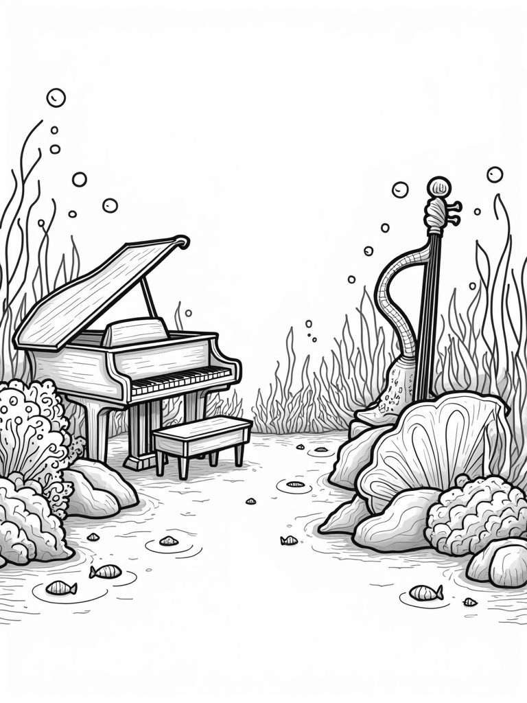 The gentle bubbles rising to the surface and the pair of starfish lounging on a giant, open clam shell create a calm atmosphere that invites you to relax and let your imagination flow. It’s like a little sanctuary under the sea where music meets nature. Grab your favorite colors and bring this serene underwater world to life!