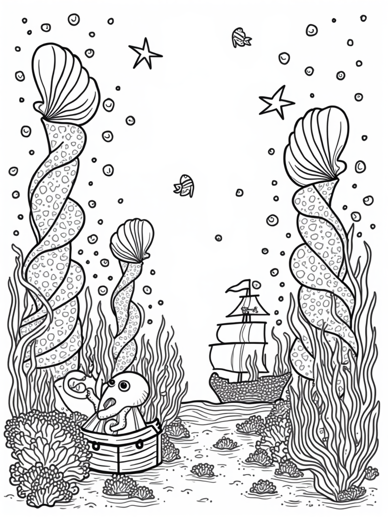 This coloring page shows a vibrant underwater garden filled with oversized seashells and playful starfish. You'll find towering coral structures that twist up like spiraling towers, all dressed in swaying seaweed. A friendly octopus is playfully wrapping around a treasure chest, while colorful fish dart around, adding life to the scene. And don’t miss the sunken ship resting on the sandy sea floor, draped in bright sea anemones!