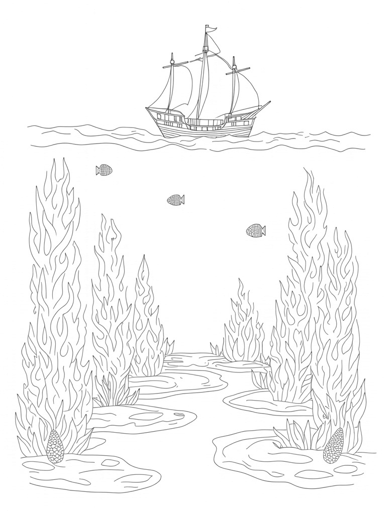 Check out this free, printable coloring page featuring a whimsical underwater garden filled with seashells, coral towers, and a sunken ship. Perfect for kids who love ocean life and coloring fun!