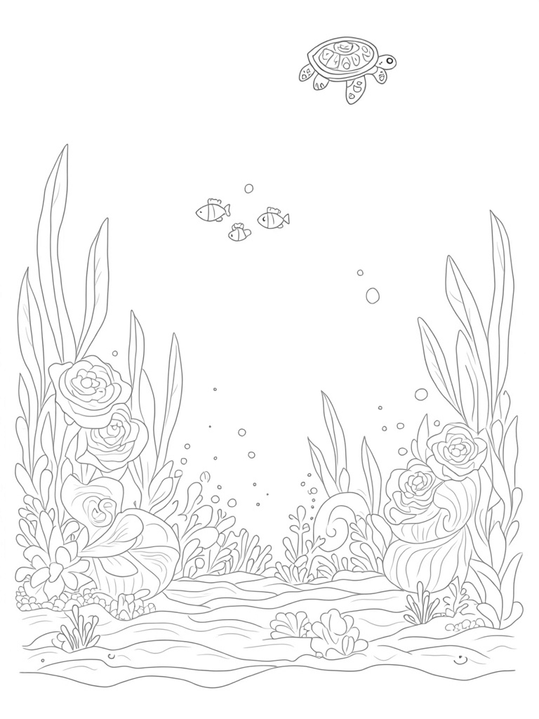 In the background, a school of tiny fish is swimming through a series of floating bubbles, adding a lively touch to the scene. Above it all, a graceful sea turtle glides by, its shell decorated with fun and whimsical designs. There’s so much to see and color in this underwater paradise!