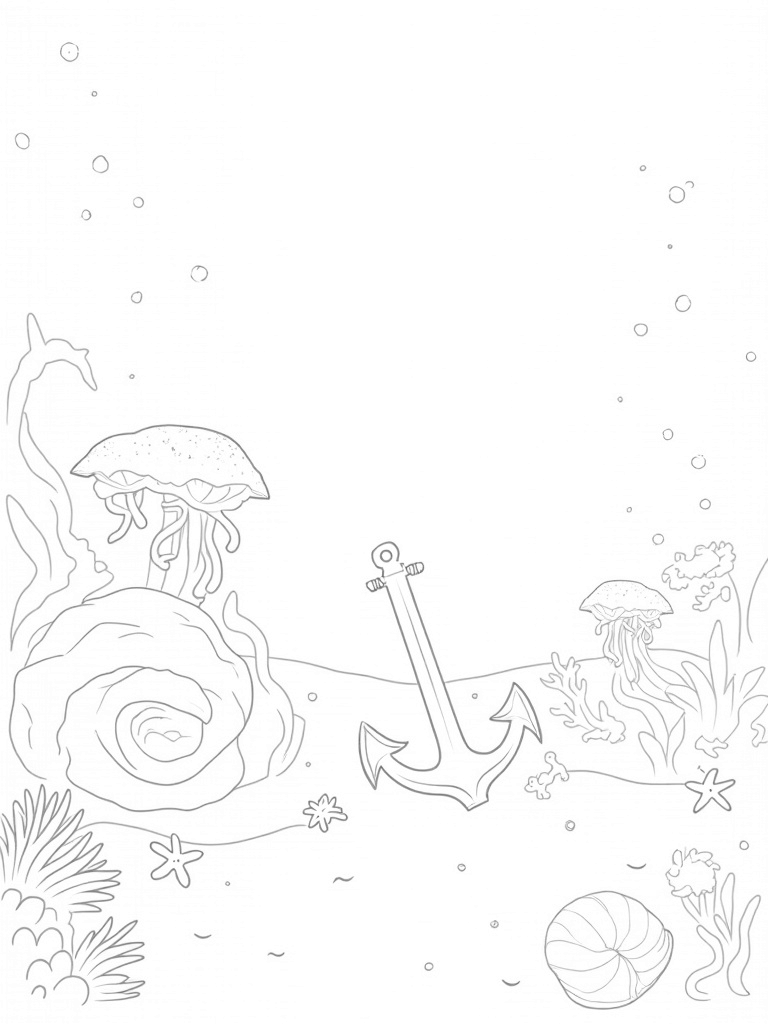 Above, you can see bubbles rising towards the surface, creating a fun and whimsical pattern in the water. And down on the sandy seabed, there’s a solitary, ornate anchor that rests quietly, draped in colorful anemones. It’s a serene scene that invites your imagination to run wild while you color!