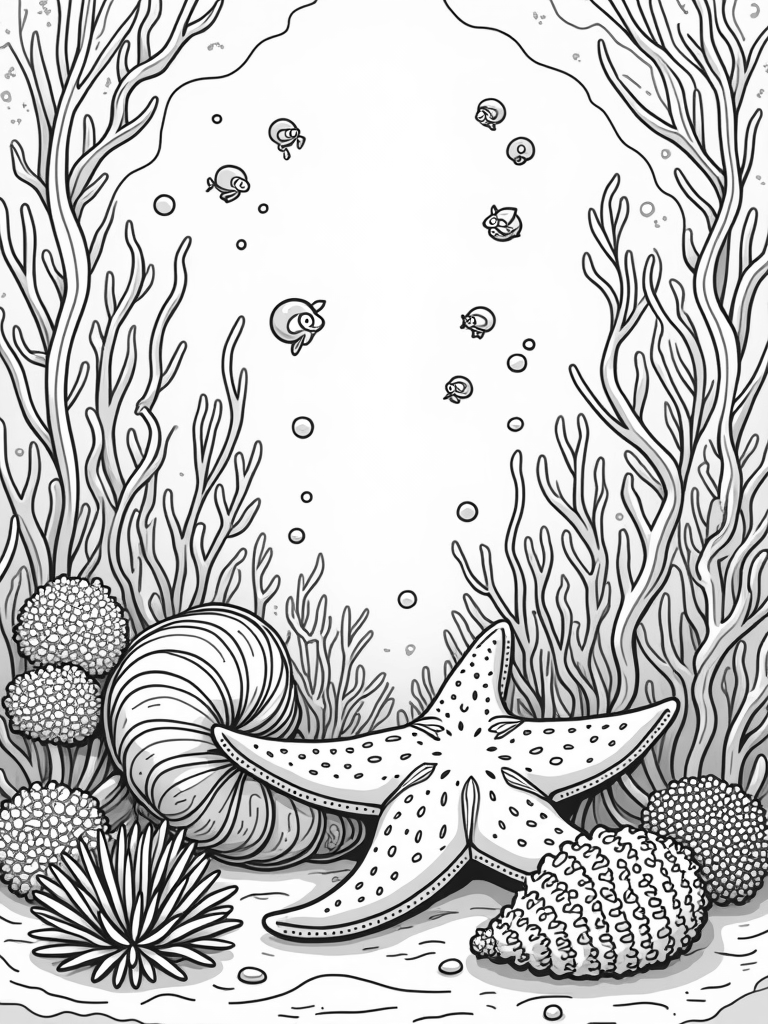 This scene brings the ocean floor to life with a vibrant underwater garden! You’ll find oversized, spiraling seashells and colorful coral formations all around. Tall kelp sways overhead, creating a cool archway while clusters of bubbles float up, each one holding a tiny fish silhouette. Right in the foreground, a giant starfish lounges on smooth pebbles, surrounded by swaying anemones and bright sea urchins. It’s a fun and lively underwater world just waiting for some color!