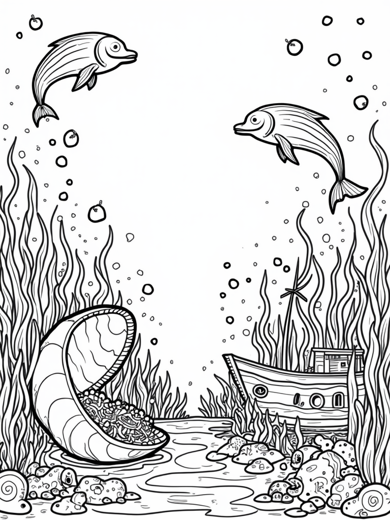 This coloring page showcases a vibrant underwater garden filled with oversized, smiling fish swimming happily among twisting coral reefs. A giant seashell opens wide to reveal a treasure trove of colorful starfish, while an ancient shipwreck rests nearby, its portholes sparkling with tiny bubbles. Towering seaweed sways gently in the currents, creating a lively backdrop for playful dolphins leaping joyfully above.