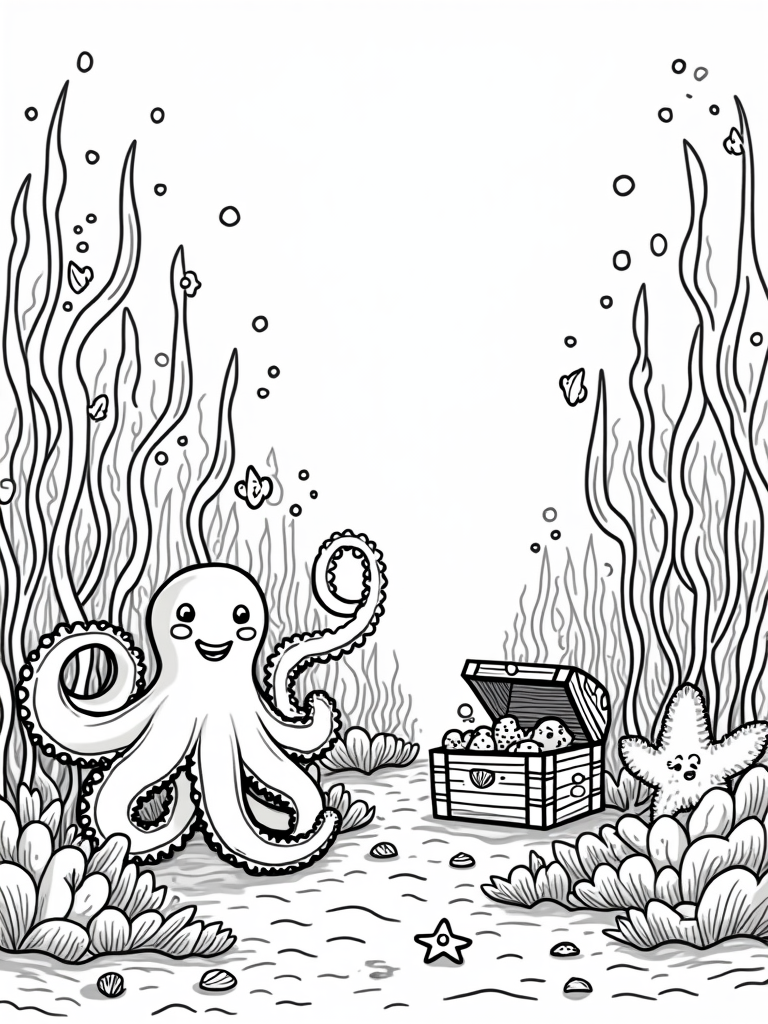 The octopus in this picture is a real star! With its cheerful demeanor, it’s unfurling its tentacles, each one artfully holding a different seashell. Imagine all the colors you can use for those shells! And don’t forget the shimmering bubbles floating up to the surface; they add a magical touch to the whole scene.